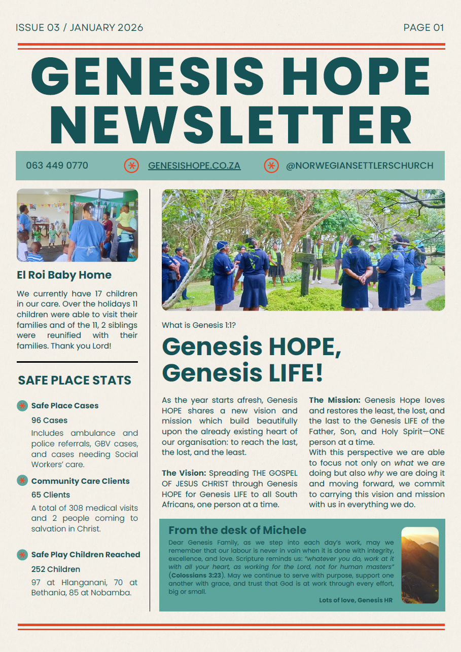Stay connected and informed with all the latest updates from Genesis Hope South Africa and its diverse range of programs and ministries by simply downloading our newsletters. Whether you're interested in our community outreach initiatives, educational programs, or general updates, our newsletters provide an overview into our ongoing work and the impact we're making.