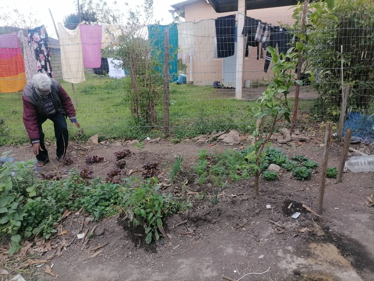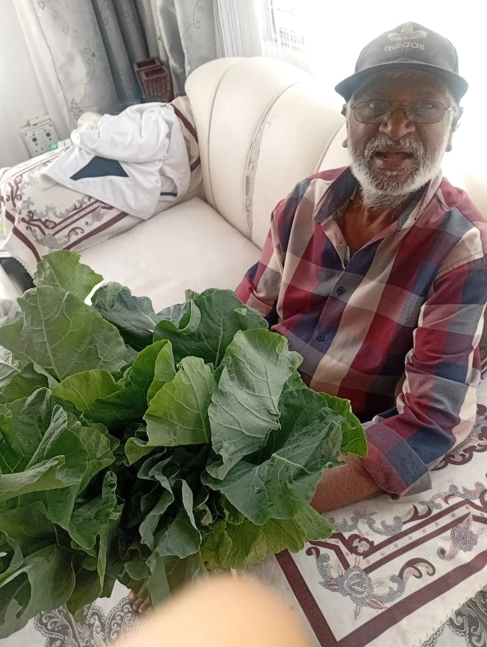 In the top photo, Simon receives fresh vegetables lovingly harvested by the Genesis team from our community garden. In the bottom photo, he stands proudly beside his own thriving veggie patch—grown from seedlings provided through our One Home, One Garden initiative.